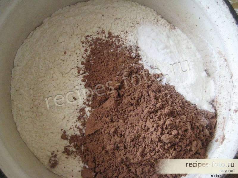 Смешаем в большой миске сухие компоненты: муку, какао, соду и разрыхлитель.